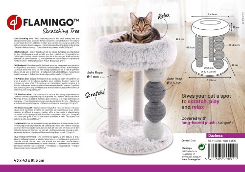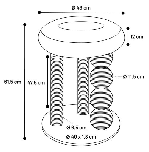 Toto škrabadlo pro kočky není jen hřištěm pro Vašeho kočičího kamaráda, ale představuje také krásný doplněk Vašeho interiéru. S plyšem 320 g/m2, jutovým provazem na škrábání a zábavnou hračkou, nabízí potřebnou stimulaci. Odpočinková plocha je příjemně polstrovaná.