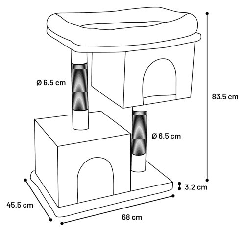 Škrabadlo Kajal představuje dokonalou relaxační oázu pro Vaše chlupaté kamarády. Je potaženo měkkým plyšem, škrabací sloupky jsou omotány sisalovým lanem. Dále disponuje polstrovaným pelíškem a 2 úkryty. Pelíšek je vyjímatelný a lze prát v pračce na 30 °C.