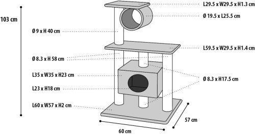 Dopřejte své kočce škrabadlo snů! Toto robustní škrabadlo má vše, co Váš chlupatý kamarád potřebuje: odpočívací plochy, hrací tunel a škrabadla. Nechte svého malého tygra volně žít a užijte si krásný kus nábytku ve svém domě.