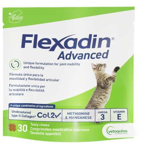 Charakteristika: Veterinární přípravek / doplněk krmiva pro kočky, v podobě ochucených medikovaných granulí. Podporuje metabolismus kloubů. Indikace: Osteoartritida (artróza) je progresivní degenerativní onemocnění kloubů zejména u starších koček, je doprovázena pohybovými potížemi, bolestivostí a deformacemi kloubů. Účinné látky: Kolagen UC II® (nedenaturovaný kolagen typu II), má prokazatelný pozitivní účinek u koček s osteoartritidou, Další látky podporující metabolismus kloubů (mastné kyseliny omega 3 a omega 6, vitamin E). Složení: Pivovarské kvasnice, ovesná mouka, ovesné vločky, žitná krupice, glycerin, prášek z kuřecích jater, lněný olej (zdroj omega-3 polynenasycených mastných kyselin), prášek z kuřecích chrupavek obsahuje UC-II® (obsahující chlorid draselný 1,47 %), kolagenový prášek celkem 1,22 % (včetně nedenaturovaného kolagenu typu II: 0,15 %) 4,8 %, rybí olej (zdroj kyseliny dokosahexaenové, DHA), pektin, sacharóza, maltodextrin, dihydrát síranu vápenatého. V tabletě: Celkem omega-3 mastných kyselin 25,42 mg, celkový obsah kyseliny dokosahexaenove (DHA) 2,37 mg, methionin 12 mg, celkový obsah manganu 1,9 mg, celkový obsah vitaminu E 7,7 IU. Dávkování: 1 tableta denně bez ohledu na hmotnost kočky, přímo perorálně nebo s krmivem.
