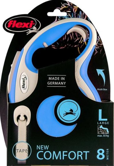 Dokonale navržené dvoubarevné vodítko Vás upoutá na první pohled. New Comfort nabízí všechny funkce, které potřebujete a proto si ho brzy zamilujete! Vylepšený brzdový systém s krátkým zdvihem umožňuje více kontroly, ergonomické držadlo je nastavitelné dle velikosti ruky (od velikosti M). Lze přidat i Multi Box pro ukládání pamlsků či sáčků (od velikosti S). Rodinná firma flexi vyrábí výhradně na území Německa. V závodě v Bargteheide u Hamburgu vzniká vše, počínaje návrhem až po výrobu vysoce kvalitních vodítek – Made in Germany. Firma flexi je vynálezcem samonavíjecího vodítka a jedničkou na světovém trhu, exportuje do více než 90 zemí světa. Originální samonavíjecí vodítka flexi se vyznačují patentovaným, po technické stránce nejmodernějším pružinovým systémem a komfortním ovládáním. Jsou vyráběna z vysoce kvalitních materiálů, exkluzivně manuálně zpracovaná a sestavená. Vodítka prochází před expedicí mnoha kontrolami kvality. Velikost: L – vhodné pro psy o hmotnosti do 60 kg. Typ vodítka: Navíjecí – pásek. Délka pásku/lanka: 8 m Barva: modrá