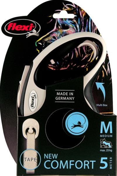 Dokonale navržené dvoubarevné vodítko Vás upoutá na první pohled. New Comfort nabízí všechny funkce, které potřebujete a proto si ho brzy zamilujete! Vylepšený brzdový systém s krátkým zdvihem umožňuje více kontroly, ergonomické držadlo je nastavitelné dle velikosti ruky (od velikosti M). Lze přidat i Multi Box pro ukládání pamlsků či sáčků (od velikosti S). Rodinná firma flexi vyrábí výhradně na území Německa. V závodě v Bargteheide u Hamburgu vzniká vše, počínaje návrhem až po výrobu vysoce kvalitních vodítek – Made in Germany. Firma flexi je vynálezcem samonavíjecího vodítka a jedničkou na světovém trhu, exportuje do více než 90 zemí světa. Originální samonavíjecí vodítka flexi se vyznačují patentovaným, po technické stránce nejmodernějším pružinovým systémem a komfortním ovládáním. Jsou vyráběna z vysoce kvalitních materiálů, exkluzivně manuálně zpracovaná a sestavená. Vodítka prochází před expedicí mnoha kontrolami kvality. Velikost: M – vhodné pro psy o hmotnosti do 25 kg. Typ vodítka: Navíjecí – pásek. Délka pásku/lanka: 5 m Barva: černá