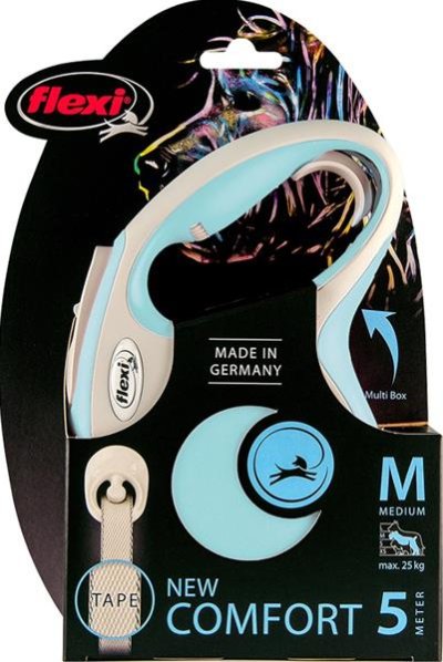 Dokonale navržené dvoubarevné vodítko Vás upoutá na první pohled. New Comfort nabízí všechny funkce, které potřebujete a proto si ho brzy zamilujete! Vylepšený brzdový systém s krátkým zdvihem umožňuje více kontroly, ergonomické držadlo je nastavitelné dle velikosti ruky (od velikosti M). Lze přidat i Multi Box pro ukládání pamlsků či sáčků (od velikosti S). Rodinná firma flexi vyrábí výhradně na území Německa. V závodě v Bargteheide u Hamburgu vzniká vše, počínaje návrhem až po výrobu vysoce kvalitních vodítek – Made in Germany. Firma flexi je vynálezcem samonavíjecího vodítka a jedničkou na světovém trhu, exportuje do více než 90 zemí světa. Originální samonavíjecí vodítka flexi se vyznačují patentovaným, po technické stránce nejmodernějším pružinovým systémem a komfortním ovládáním. Jsou vyráběna z vysoce kvalitních materiálů, exkluzivně manuálně zpracovaná a sestavená. Vodítka prochází před expedicí mnoha kontrolami kvality. Velikost: M – vhodné pro psy o hmotnosti do 25 kg. Typ vodítka: Navíjecí – pásek. Délka pásku/lanka: 5 m Barva: světle modrá