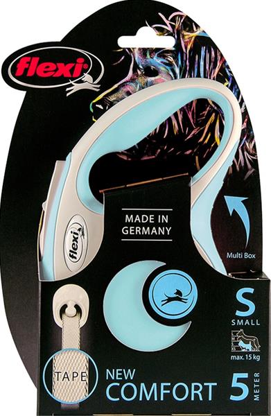 Dokonale navržené dvoubarevné vodítko Vás upoutá na první pohled. New Comfort nabízí všechny funkce, které potřebujete a proto si ho brzy zamilujete! Vylepšený brzdový systém s krátkým zdvihem umožňuje více kontroly, ergonomické držadlo je nastavitelné dle velikosti ruky (od velikosti M). Lze přidat i Multi Box pro ukládání pamlsků či sáčků (od velikosti S). Rodinná firma flexi vyrábí výhradně na území Německa. V závodě v Bargteheide u Hamburgu vzniká vše, počínaje návrhem až po výrobu vysoce kvalitních vodítek – Made in Germany. Firma flexi je vynálezcem samonavíjecího vodítka a jedničkou na světovém trhu, exportuje do více než 90 zemí světa. Originální samonavíjecí vodítka flexi se vyznačují patentovaným, po technické stránce nejmodernějším pružinovým systémem a komfortním ovládáním. Jsou vyráběna z vysoce kvalitních materiálů, exkluzivně manuálně zpracovaná a sestavená. Vodítka prochází před expedicí mnoha kontrolami kvality. Velikost: S – vhodné pro psy o hmotnosti do 15 kg. Typ vodítka: Navíjecí – pásek. Délka pásku/lanka: 5 m Barva: světle modrá