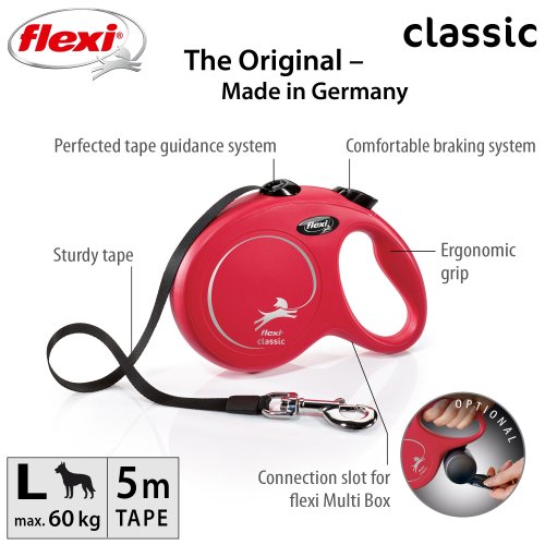 Vodítka flexi® Classic nabízí pohodlný úchop, odolný navíjecí systém i kvalitní, bezpečný a intuitivní brzdový systém, který ve zlomku vteřiny zastaví pohyb psa. Pro snadné upevnění vodítka k obojku nebo postroji je vodítko opatřeno chromovanou karabinou. Samozřejmostí je zdokonalený výstup pásku, který zajišťuje manipulaci v libovolném směru bez zasekávání - potvrzeno nesčetnými testy.