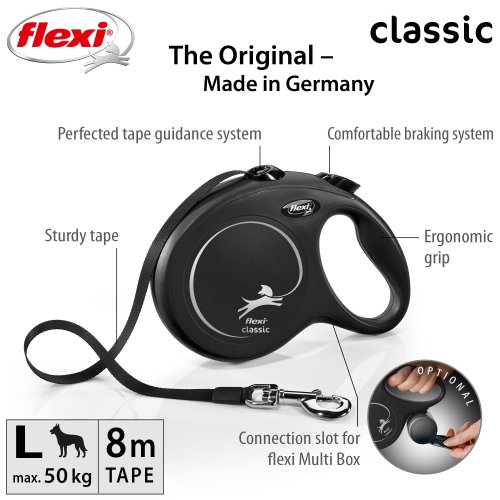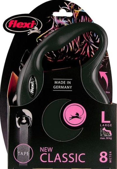 Vodítka flexi® Classic nabízí pohodlný úchop, odolný navíjecí systém i kvalitní, bezpečný a intuitivní brzdový systém, který ve zlomku vteřiny zastaví pohyb psa. Pro snadné upevnění vodítka k obojku nebo postroji je vodítko opatřeno chromovanou karabinou. Samozřejmostí je zdokonalený výstup pásku, který zajišťuje manipulaci v libovolném směru bez zasekávání - potvrzeno nesčetnými testy.
