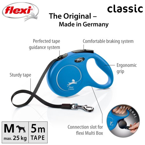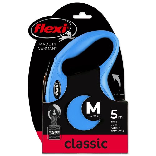 Vodítka flexi® Classic nabízí pohodlný úchop, odolný navíjecí systém i kvalitní, bezpečný a intuitivní brzdový systém, který ve zlomku vteřiny zastaví pohyb psa. Pro snadné upevnění vodítka k obojku nebo postroji je vodítko opatřeno chromovanou karabinou. Samozřejmostí je zdokonalený výstup pásku, který zajišťuje manipulaci v libovolném směru bez zasekávání - potvrzeno nesčetnými testy.