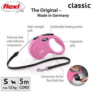 Vodítka flexi® classic nabízí pohodlný úchop, odolný navíjecí systém i kvalitní, bezpečný a intuitivní brzdný systém, který ve zlomku vteřiny zastaví pohyb psa. Pro snadné upevnění vodítka k obojku nebo postroji je vodítko opatřeno chromovanou karabinou. Moderní design lze zároveň kombinovat s praktickými doplňky flexi® Multi Box a flexi® LED osvětlením (kromě velikosti XS).