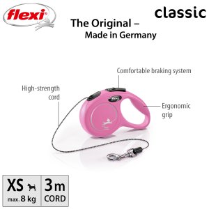 Vodítka flexi® classic nabízí pohodlný úchop, odolný navíjecí systém i kvalitní, bezpečný a intuitivní brzdný systém, který ve zlomku vteřiny zastaví pohyb psa. Pro snadné upevnění vodítka k obojku nebo postroji je vodítko opatřeno chromovanou karabinou. Moderní design lze zároveň kombinovat s praktickými doplňky flexi® Multi Box a flexi® LED osvětlením (platí pro velikost S, M a L).