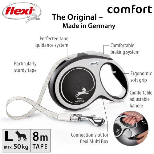 Pohodlné a díky svému dokonale sladěnému designu i unikátní - to je vodítko flexi® Comfort, které nabízí Vašemu čtyřnohému příteli vše, co psi milují: pohyb, pohyb a ještě jednou pohyb! Vás jistě potěší extra pohodlná, měkká rukojeť (ve velikosti M a L je navíc nastavitelná) i zdokonalený výstup a vedení pásku všemi směry bez zasekávání. Na každé procházce oceníte i bezpečný a intuitivní brzdový systém, který ve zlomku vteřiny zastaví pohyb psa. Pro snadné upevnění vodítka k obojku nebo postroji je vodítko opatřeno kvalitní chromovanou karabinou.