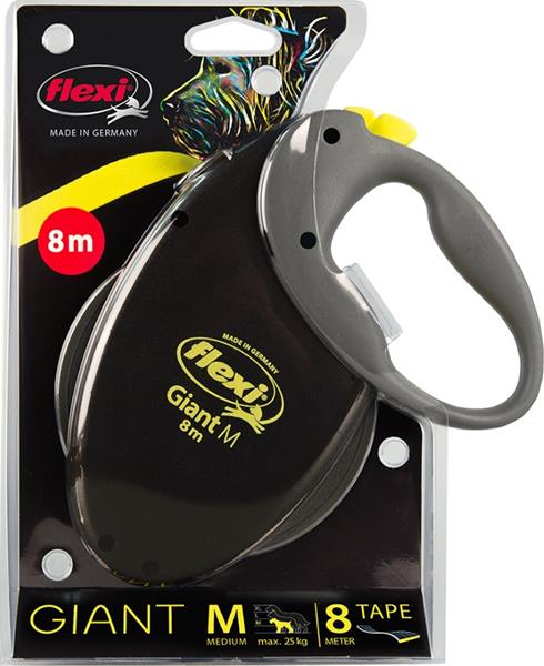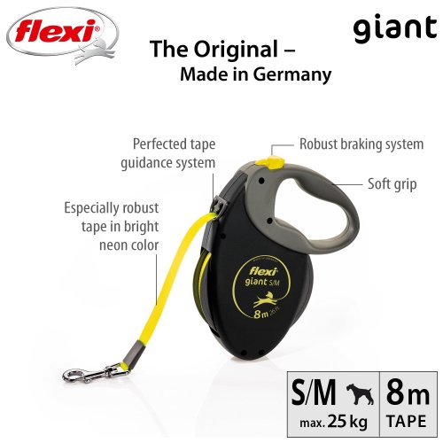 Flexi má srdce pro velké psy! Vodítko flexi® Giant S/M je navrženo pro silné a aktivní psy až do hmotnosti 25 kg a nabízí volný pohyb do vzdálenosti 8 metrů. A co nabízí Vám? Měkkou rukojeť pro dlouhé výlety a tréninky a mnoho dalších benefitů: