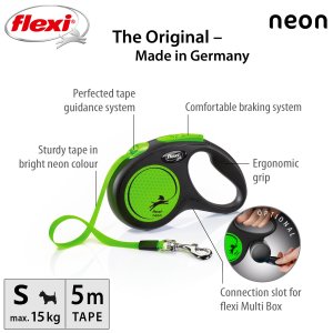 Flexi® Neon zároveň nabízí i nesčetnými testy zdokonalený výstup a vedení pásku všemi směry bez zasekávání. S délkou 5 m poskytuje Vašemu parťákovi potřebnou volnost pohybu.