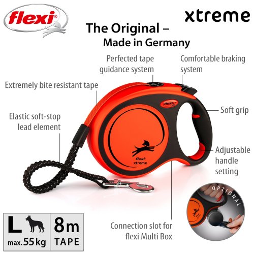 Extrémně odolné vodítko nejen pro milovníky adrenalinu. Ať už je Váš čtyřnohý parťák obzvlášť aktivní nebo vás čekají dobrodružné výzvy, flexi® Xtreme nabízí ještě větší bezpečnost s extrémně odolným páskem flexi® X11 a více pohodlí díky integrovanému tlumiči Soft-Stop. K většímu bezpečí přispívá i výrazná barva, která je snadno rozpoznatelná z dálky i za soumraku. Protože čím delší je vodítko, tím důležitější je, aby bylo dobře viditelné. Pro Vaše pohodlí disponuje flexi® Xtreme ve velikostech M a L nastavitelnou rukojetí. Rukojeť lze přizpůsobit velikosti Vaší ruky pro pevný úchop na každé procházce. Samozřejmostí je i nesčetnými testy zdokonalený výstup a vedení pásku všemi směry bez zasekávání.