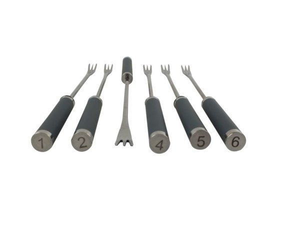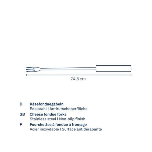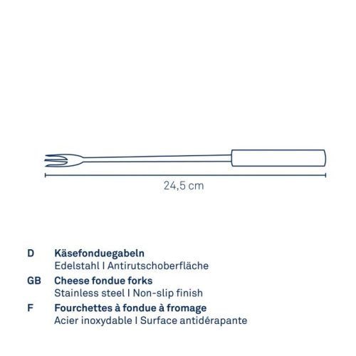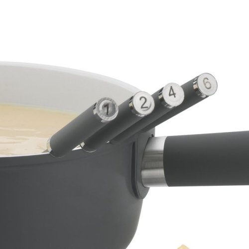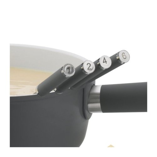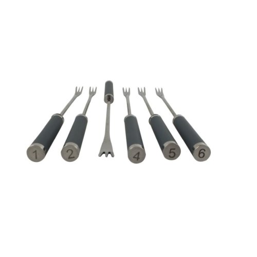Fondue vidličky jsou nezbytnou součástí pro přípravu masového, sýrového a čokoládového fondue, s označením na konci rukojeti pro snadné rozlišení. Vyrobeno z prvotřídní nerezavějící oceli a měkčeného silikonu pro pohodlný úchop.- nerezová ocel / silikon- sada obsahuje celkem 6 vidliček- délka: 24,5 cm- barva rukojeti: antracitová