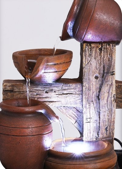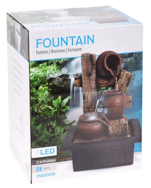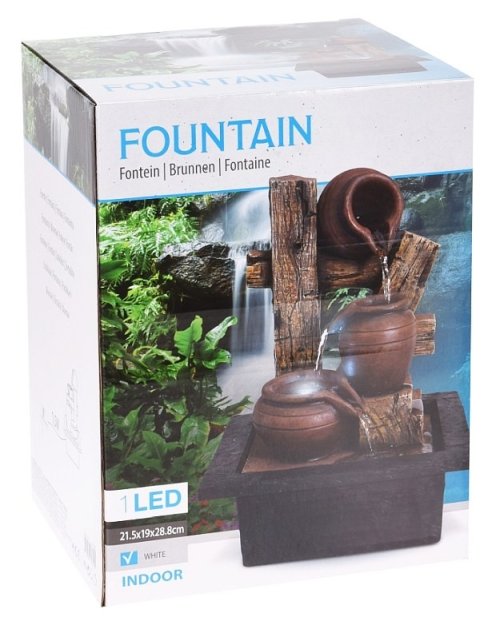 dekorační pokojová fontánka s uzavřeným oběhem vody- poskytuje příjemné klima, jelikož přirozeně zvlhčuje vzduch- osvětlení ještě více podtrhne příjemnou atmosféru a společně se zvuky tekoucího vodopádu přispějí k celkové relaxaci- vyrobená z polyresinu, který si dlouho drží barevnou stálost a navíc je odolný vůči UV záření, vůbec tedy nevadí, když ji postavíte na přímé sluneční světlo- atmosferická LED světelná dioda s dlouhou životností- neustálá cirkulace vody s nízkými náklady na energii- vnitřní tiché čerpadlo zajišťuje nekonečné spolehlivé používání- tato soběstačná interiérová fontána může být umístěna kdekoliv v domácnosti i v krytém exteriéru- rychlé a jednoduché zprovoznění nezabere ani minutu- délka přívodního kabelu 1,5 metru- rozměry: 22 x 19 x výška 29 cm- napájení: 220 až 240 V
