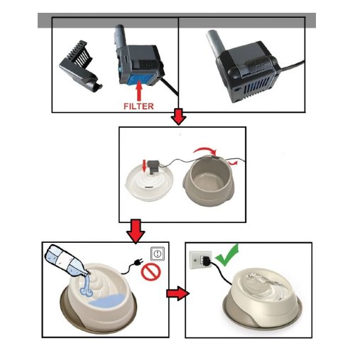 Obsahuje vodní pumpu vysoké kvality vyrobenou v Itálii. Vodní pumpa funguje i při velmi nízké hladině vody vytvořením vlastního mini koloběhu, nemusíte se tedy obávat, že v případě Vaší nepřítomnosti kdy by zvíře mohlo vypít velké množství vody a vodní pumpa přestane fungovat.