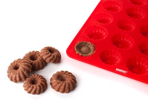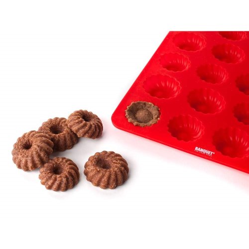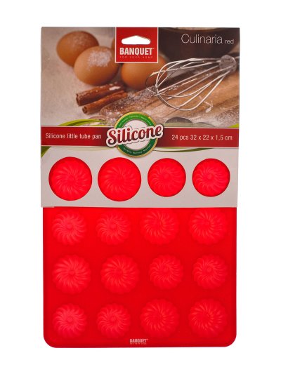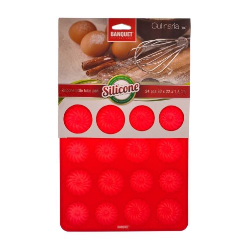 Silikonová forma na 24 ks báboviček CULINARIA Red. Forma je odolná vysokým teplotám do 240 st. C, lze jí používat do elektrické i mikrovlnné trouby, neváže chutě ani pachy pokrmů, snadno se udržuje, lze mýt v myčce na nádobí. Silikon je velmi populární materiál, který pro své jedinečné vlastnosti našel své uplatnění i v kuchyni. Vyrábí se z něj různé druhy forem na pečení, vály a válečky na těsto, stěrky, mašlovačky, různé druhy kuchyňské náčiní a mnohé další výrobky.
