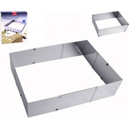 Posuvná forma na pečení dortů různých velikostí. Jedna forma postačí k vytvoření několikapatrových dortů. Obdélníkový tvar. Nerezový materiál. Rozměry 24/47 x 20/38 x 6 cm. EAN 8592381067168