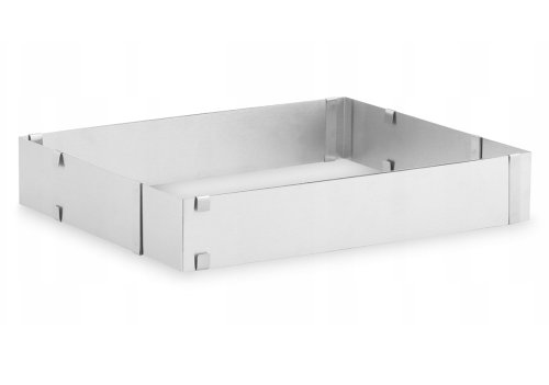Posuvná forma na pečení dortů různých velikostí. Jedna forma postačí k vytvoření několikapatrových dortů. Obdélníkový tvar. Kvalitní nerezový materiál 18/10. Rozměry variabilní 35 až 53 x 18 až 28 a výška 5 cm. Vhodné do myčky nádobí. EAN 5902041309775