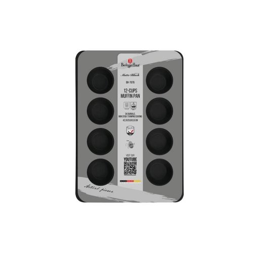 ocelový plech , 3vrstvý nepřilnavý povrch Titan Pro - žáruvdzorné do teploty 220°C - vhodné do myčky nádobí - na 12 ks muffinů - rozměry: 35 x 26 cm - výška: 3 cm - ECOfriendly: neobsahuje olovo, PFOA ani kadmium - barva černá matná