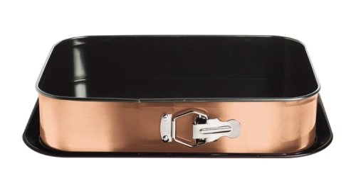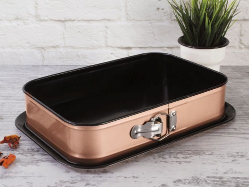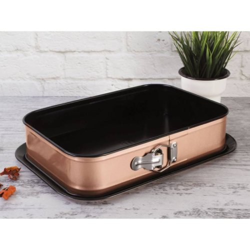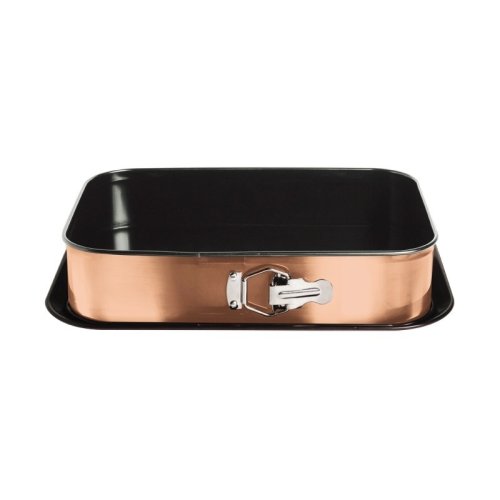 materiál: uhlíková ocel s nepřilnavým povrchem - nepřilnavý povrch vhodný pro pečení s minimem tuku - velmi pohodlná údržba, jídlo se nepřipaluje - rozkládací forma s oddělitelným dnem - spodní díl v sadě využitelný jako servírovací tác - rozměry: 39 x 27 x 7.5 cm - vhodné do trouby do teploty 240°C - rosegold metalická vnější barva - ECOfriendly, neobsahuje žádné škodliviny jako Pfoa, olovo ani kadmium