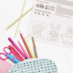 Originální balení: na zadní straně papírové karty, na které je forma připevněna, jsou pro děti připraveny obrázky zvířátek, které si mohou dle vlastní fantazie vybarvit, vystřihnout, nalepit na špejli a hrát s nimi divadlo.
