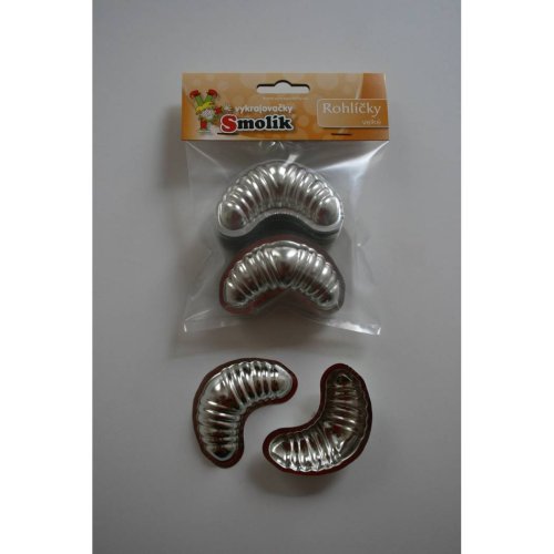 Vyklápěcí formičky z pocínovaného plechu ve tvaru rohlíčků.