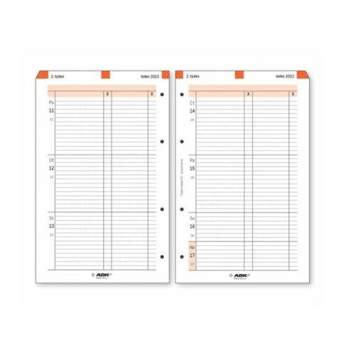Termínovaný formulář pro týdenní plánování dvoustranný do diářů ADK formátu A5 Celý týden na jeden pohled Levá strana od mechaniky: pondělí – středa Pravá strana od mechaniky: čtvrtek – neděle Rozměry: …