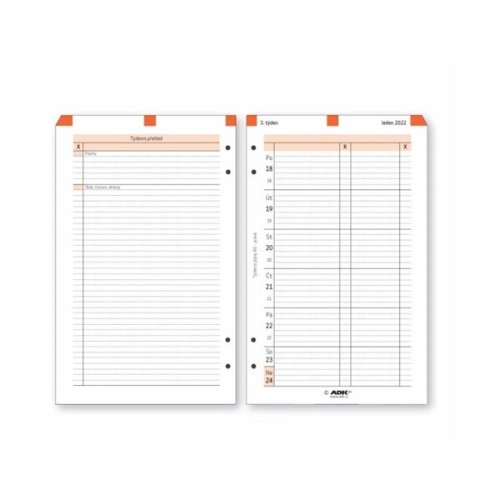 Termínovaný formulář pro týdenní plánování pravý do diářů ADK formátu A6 53 listů (1 list pro každý týden) Levá strana od mechaniky: volné řádky na poznámky Pravá strana od mechaniky: přehled celého …