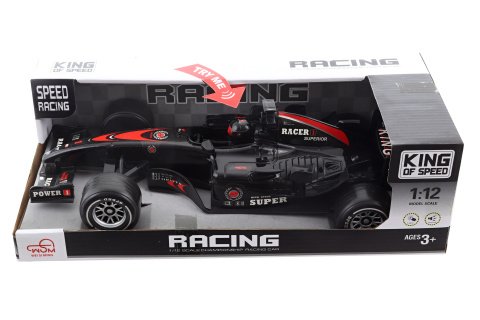 Formule na baterie na setrvačník. Napájení na 3xAG13 baterie - jsou součástí balení. Po zmačknutí hlavy řidiče formule svítí a vydává zvuky jízdy. Baleno v otevřené krabici. Rozměry balení cca 36x11x16 cm. Věk 3+