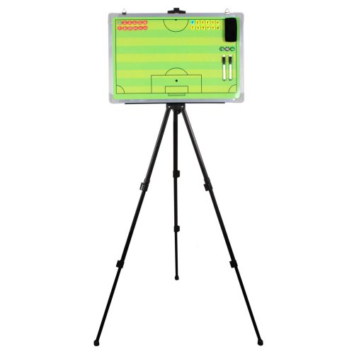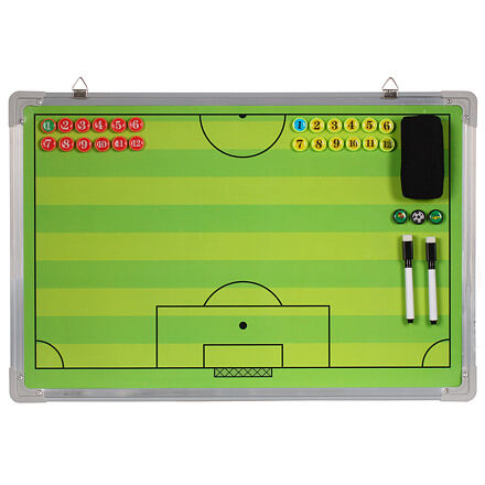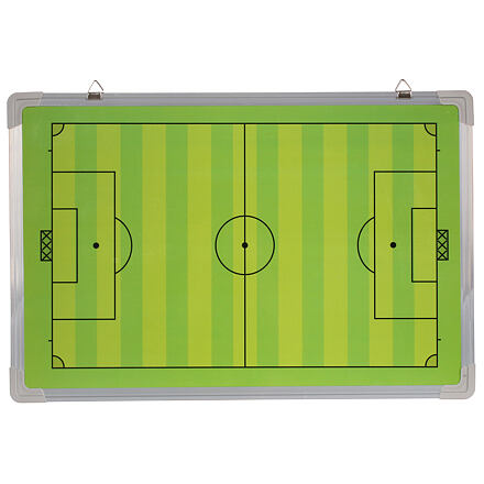 Trenérská tabule na fotbal je nezbytný doplněk každého fotbalového trenéra napříč všemi soutěžemi. Taktická fotbalová tabule Merco Fotbal 45 je oboustranná magnetická deska s barevným provedením poloviny hřiště z jedné strany a z druhé strany celého fotbalového hřiště, je vyrobená z PVC materiálu v hliníkovém rámu. Součástí fotbalové tabule Merco Fotbal 45 jsou barevně rozlišené magnety symbolizující hráče a černý popisovač, jehož součástí je i malá houbička pro smazání. Závěsná trenérská tabule Merco Fotbal 45 je ideální pomocník pro taktické porady a vytvoření takové herní situace, díky které Váš tým spolehlivě zaskóruje. Celkový rozměr této tabule je 60 x 40 cm a její hmotnost 1,1 kg. Navíc tento model obsahuje i nastavitelný stojánek a praktickou tašku, díky které celý set pohodlně kamkoliv a kdykoliv přenesete. Stojánek je možné nastavit na výšku 43 - 110 cm, rozměr tašky je 65 x 46 x 10 cm a hmotnost celé sady včetně tašky je cca 2,5 kg.