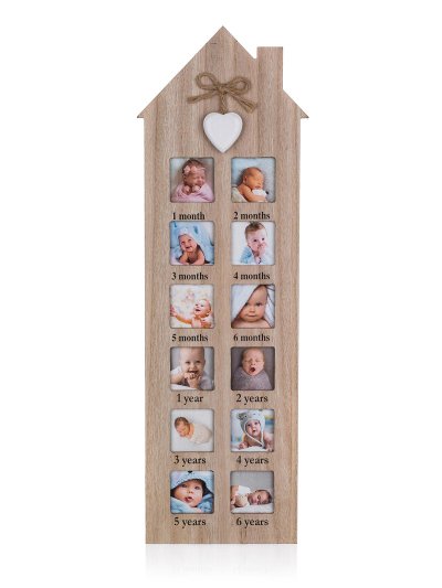 Fotorámeček BABY 0-6 let 48 x 14,8 x 0,8 cm ve tvaru vysokého domku s komínem, je vybaven 6 okénky 1 až 6 month a 6 okénky 1 až 6 years (12 fotografií 5x5cm). Fotorámeček je vybaven praktickým závěsem k montáži na stěnu.