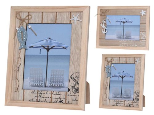 Stylový dřevěný fotorámeček o rozměrech 260×210 mm v přírodním provedení je ozdoben motivy inspirovanými mořem. Díky různým variantám (mix) nabízí jedinečný design pro každý interiér. Skvěle se hodí k vystavení oblíbených fotografií z dovolené, rodinných momentů či vzpomínek spojených s létem. Přírodní materiál dodává rámu hřejivý a nadčasový vzhled, který perfektně doplní váš domov nebo může posloužit jako originální dárek. Zboží je dodáváno v mixu. Doručované zboží je vybíráno náhodně a nelze vybrat konkrétní provedení.