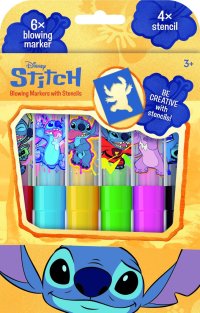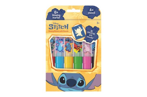 Balení obsahuje 6 barevných foukacích fixů s potiskem a 4 barevné papírové šablonky v oblíbených motivech.