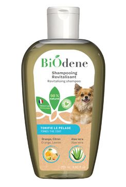 Šampon Biodene revitalizační obsahuje směs pěti rostlinných extraktů (borůvek, pomerančů, citronů, cukrové třtiny a javoru), které stimulují opětovný růst buněk, jemně exfoliují a zjemňují pokožku a srst. Při pravidelném používání, posiluje pokožku a obnovuje sílu a vitalitu matné srsti.