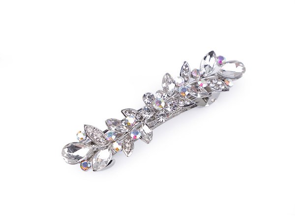 Francouzská štrasová spona s květy luxusně ozdobí slavnostní účes. Má velmi kvalitní celokovové provedení. Zacvakávací mechanismus je pevný. Spona je zdobená skleněnými kameny, které jsou vyskládané do tvaru rostlin. Broušené kamínky s AB efektem se oslnivě třpytí, upoutají pozornost už z dálky. Délka části pro vlasy je 3,5 cm.