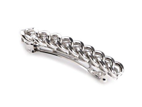 Francouzská spona ozdobená řetězem má velmi kvalitní celokovové provedení. Je lesklá, což z ní činí perfektní volbu pro slavnostní příležitosti i každodenní nošení. Vašemu účesu dodá nevšední nádech a originalitu. Zacvakávací mechanismus zapínání je pevný a spolehlivý, spona udrží vaše vlasy dokonale na svém místě po celý den. Délka části pro vlasy je 5 cm.