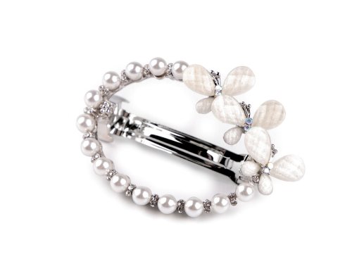 Francouzská spona s perlami a broušenými kamínky je ozdobená motýlky. Dokonale ozdobí slavnostní účes, ať už se chystáte na svatbu, večírek nebo romantickou večeři. Vašemu vzhledu dodá kouzlo a eleganci, můžete ji využít k upevnění vlasů do složitých účesů nebo k jednoduchému stažení pramenů dozadu. Má kvalitní celokovové provedení, zacvakávací mechanismus je pevný. Délka části pro vlasy je 3,5 cm.
