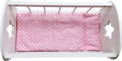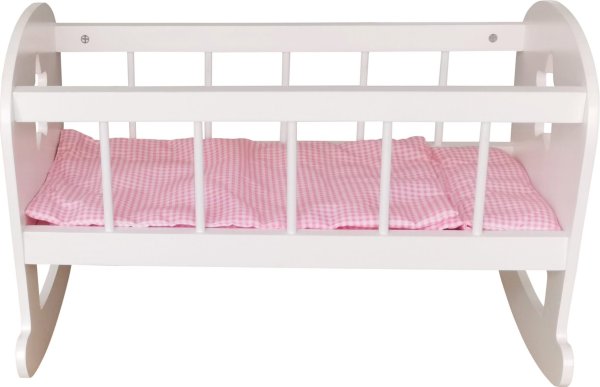 Dřevěná kolébka pro panenky, plyšová zvířátka a jiné hračky až do 40 cm . Kolébka je vyrobena z kvalitního dřeva a má bílou barvu. Součástí balení je také peřinka a polštářek pro panenku. Rozměry kolébky jsou 46 x 33 x 32,7 cm. Poznámka: Dodáváno v kartonové krabici v rozloženém stavu.