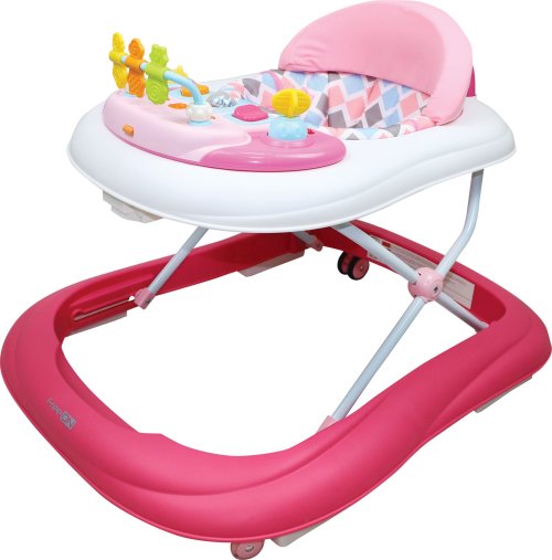 široká základna pro lepší stabilitu pohodlné, posltrované, odnímatelné a omyvatelné sedátko 3 výškové polohy sedátka, které odpovídají výšce dítěte 6 zarážek zabraňujících převrácení nebo pádu ze schodů 4 kolečka - přední kolečka se otáčejí o 360 stupňů vyjímatelný barevný pultík s hračkami a hudbou a světýlky snadno se skládá a skladuje snadná montáž