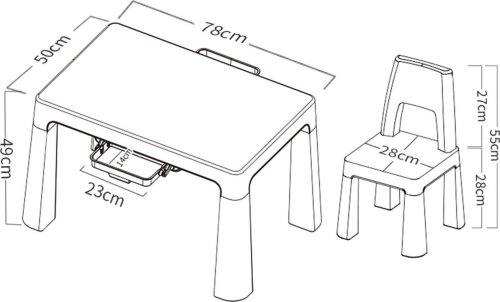 odolný plast moderní vzhled dva šuplíčky na drobnosti 23 x 14 cm nastavitelný do dvou výšek kompaktní a stabilní 2 židličky