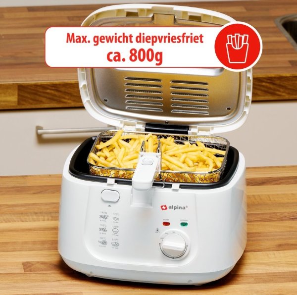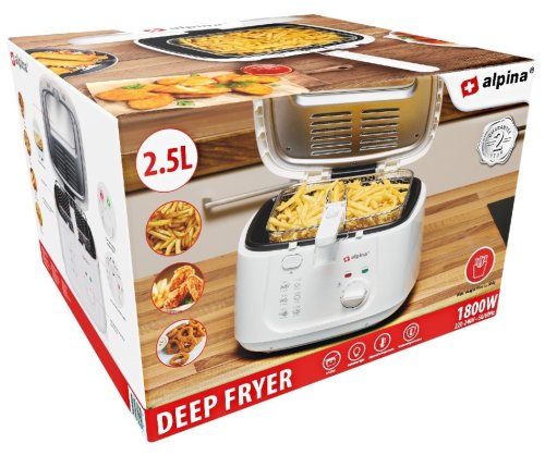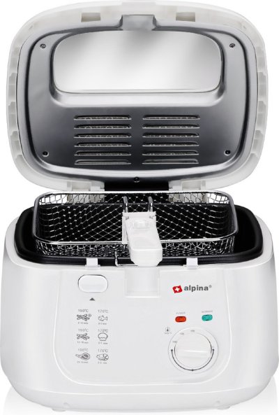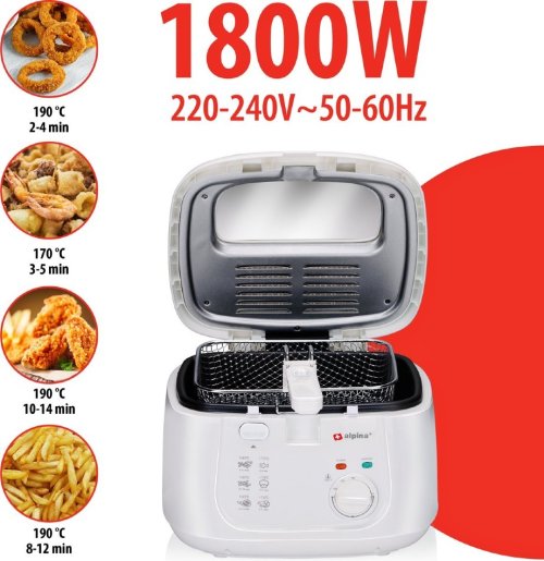 Máte chuť na večer s hranolky? S fritézou alpina připravíte ty nejchutnější občerstvení pohodlně doma, zcela jednoduše a rychle. S výkonem 1800 W, objemem 2,5 litru a nastavením teploty mezi 150 a 190 stupni si můžete vychutnat perfektní hranolky a svačinky. Díky víku je vzduch z fritézy minimalizován. Praktický filtr proti tuku zajišťuje zdravější smažení. Fritovací koš je pro snadné čištění odnímatelný a má bezpečnostní uzávěr.Specifikace fritézy alpinaModel: DF-165Výkon: 1800 WObsah 2,5 litru.KontrolkaNepřilnavá vrstva.Nastavitelná teplota 0-190 °C.