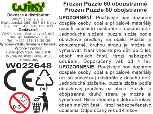 Lisciani Frozen Puzzle MaxiFloor 60 oboustranné 2v1. Oboustranné puzzle, 60 dílků. Rozměry 70 x 50 cm. Obrázek Elsa a Anna. Přední strana s barevným obrázkem, na zadní straně předkreslený k vymalování.