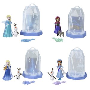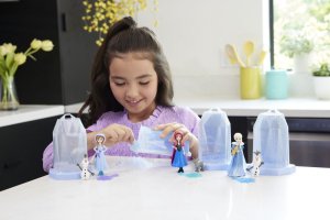Tato kolekce malých panenek s překvapeními nabízí inovativní zážitek při rozbalování díky Squishy Ice™ - ledově modré želé směsi. Děti se pomocí přiložené lopatky prohrabou nádobkou se Squishy Ice™ a objeví poklady uvnitř: malou panenku Annu nebo Elsu, postavičku kamaráda a 4 hrací prvky.