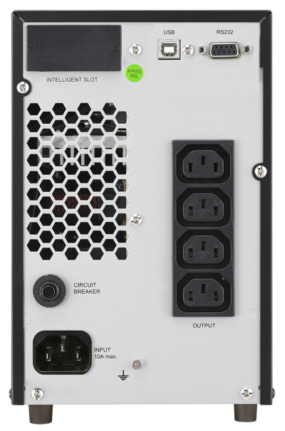 Hlavní vlastnosti: *Dvojitá konverze *Řízení mikroprocesorem optimalizuje spolehlivost *Korekce vstupního příkonu *Výkonový faktor 0.9 *Konverzní mód *Režim ECO pro úsporu energie *Funkce Smart SNMP funguje dobře s USB nebo RS-232 *Komplexní displaj umožňuje snadné sledování a přístup k stavu UPS