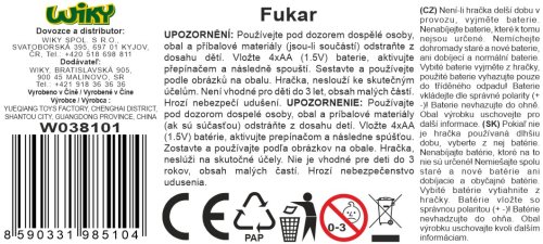 Fukar. Rozměry 45x9x18 cm. Vydává zvukové efekty. 4xAA baterie, nejsou součástí balení. Přepínač ON/OFF.