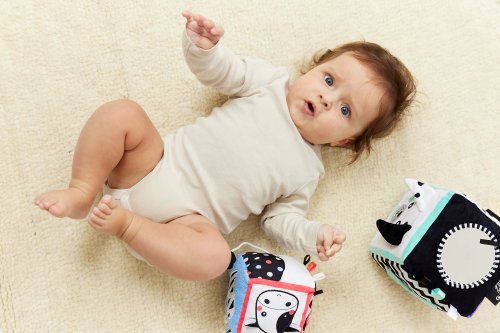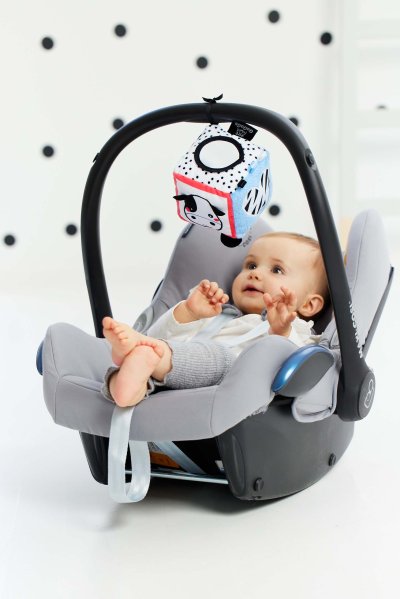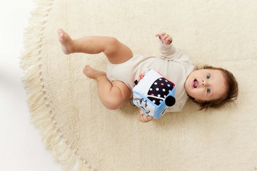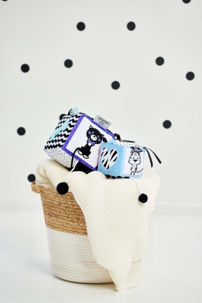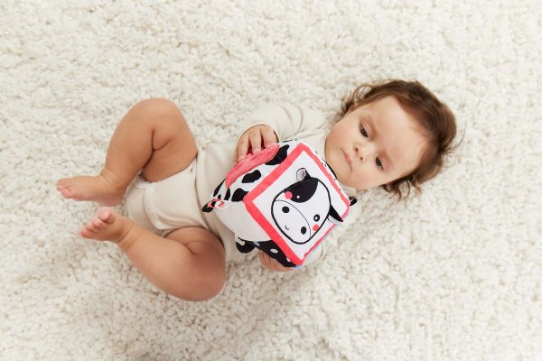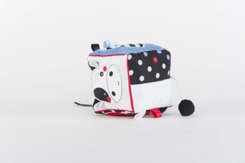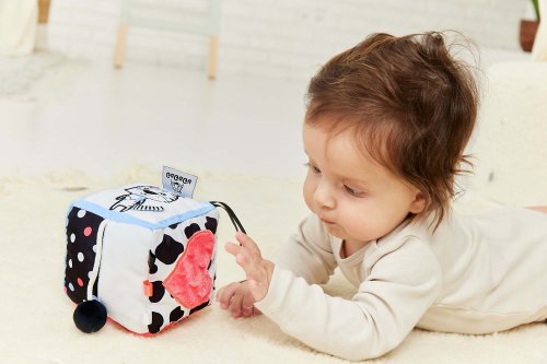 Ať je vaše miminko jakkoli nadané, na hraní s Rubikovou kostkou je ještě příliš brzy. Pro kojence od 3 měsíců doporučujeme spíše plyšovou senzorickou kostku s obrázky přátelské krávy a skotačivého tygra. Kostka GaGaGu má kontrastní barvy a vzory, což stimuluje zrak dítěte. Každá strana kostky je úplně jiná, vyrobena z jiných materiálů (s různými texturami), což dává 6 zcela odlišných smyslových zážitků – vizuálních a hmatových. Dvě strany kostky mají vyčnívající prvky zvířátek – kravské uši, tygří ocas – dítě se učí různé textury materiálů, může uchopit vyčnívající prvky a procvičovat si tak jemnou motoriku. Na další plyšové straně je kapsička s plyšovým míčkem na provázku – prvek vybízí děti k uchopení míčku a jeho vkládání a vyjímání z kapsy – to podporuje tzv. jemné motorické dovednosti a učení motorické koordinace. Na další z plyšových stran je zrcátko, které přitahuje pozornost miminka, vybízí ho, aby kostku uchopil a dozvěděl se o svém odrazu. Z druhé strany jsou našity další stuhy, které zároveň stimulují jemnou motoriku. Věk 3m+