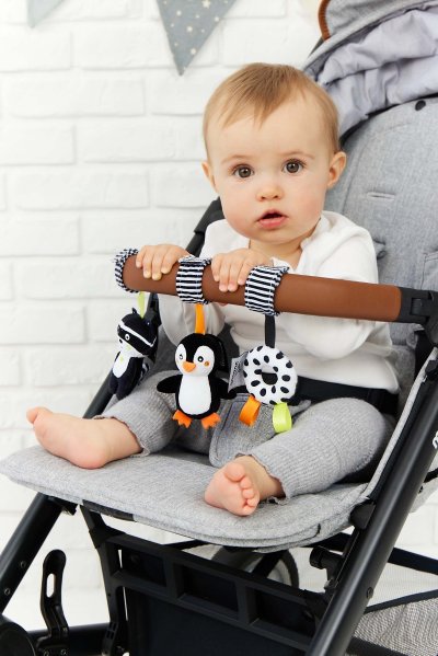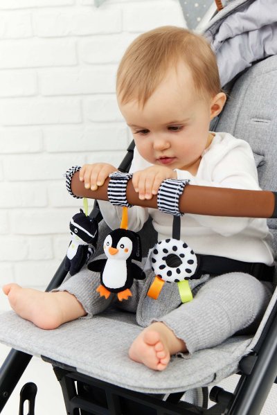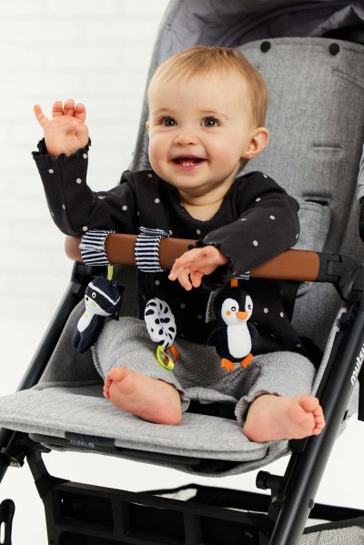 Génius je ten, kdo vidí víc než ostatní. Pokud tedy budete zrak svého dítěte od samého počátku správně stimulovat…. kdo ví, co všechno bude schopné rozpoznat! Pro začátek budou vhodné závěsný plyšový Mýval, Tučňák a Donut.Závěsná plyšová hračka GaGaGu má kontrastní barvy a vzory, které stimulují zrak dítěte. Plyšové prvky – opice, panda a míč – a stuhy vybízejí děti, aby je uchopily a podpořily tzv. jemnou motoriku (pohyby prstů a rukou) a učení motorické koordinace. Pohodlný způsob zapínání na suchý zip (příjemný na dotek a snadné zapínání) vám umožní přívěsek připevnit kamkoli, například na kočárek, na postýlku, na houpačku nebo autosedačku. Věk 0+