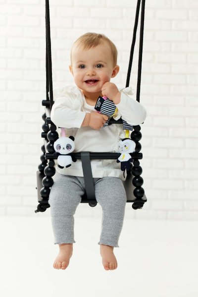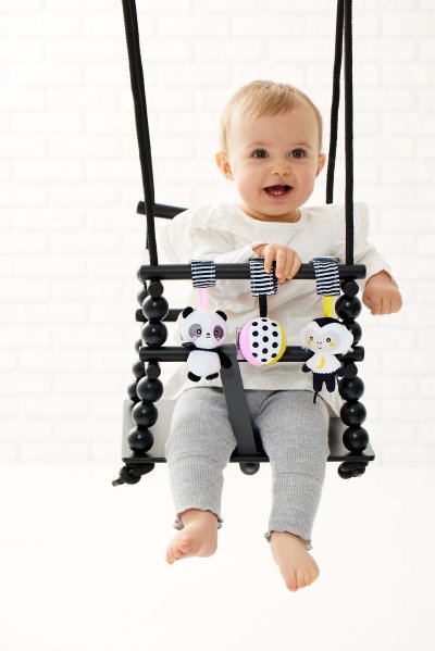Génius je ten, kdo vidí víc než ostatní. Pokud tedy budete zrak svého dítěte od samého počátku správně stimulovat…. kdo ví, co všechno bude schopné rozpoznat! Pro začátek budou vhodné závěsná plyšová Opička, Panda a Míček.Závěsná plyšová hračka GaGaGu má kontrastní barvy a vzory, které stimulují zrak dítěte. Plyšové prvky – opice, panda a míč – a stuhy vybízejí děti, aby je uchopily a podpořily tzv. jemnou motoriku (pohyby prstů a rukou) a učení motorické koordinace. Pohodlný způsob zapínání na suchý zip (příjemný na dotek a snadné zapínání) vám umožní přívěsek připevnit kamkoli, například na kočárek, na postýlku, na houpačku nebo autosedačku. Věk 0+