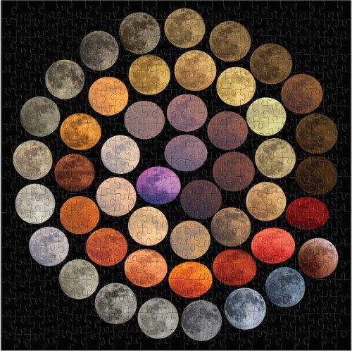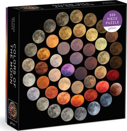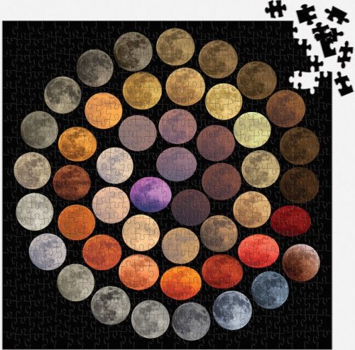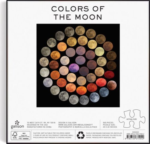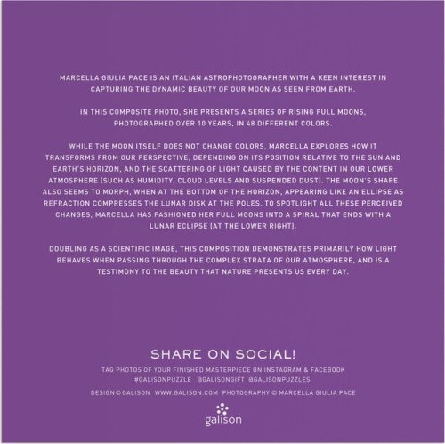 Puzzle Barvy Měsíce ukazuje barvy Měsíce v úplňku, které astrofotografka Marcella Julia Paceová zdokumentovala na různých místech své rodné Itálie v průběhu deseti let. Červená nebo žlutá barva Měsíce často značí, že je Měsíc pozorován těsne nad obzorem. Modře zbarvené měsíce jsou vzácnější a indikuje Měsíc pozorovaný skrze atmosféru, která nese větší prachové částice. Součástí balení jse předloha skládaného motivu. Rozměr složeného puzzle cca 51 x 51 cm